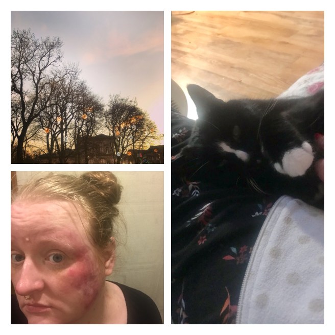 Back home I lost a battle with some frost & my driveway. Snuggled with my puss cat & put the tree up.