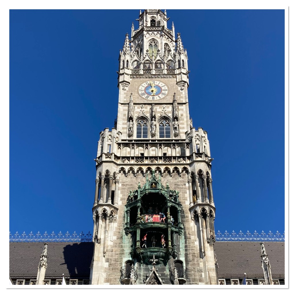 Our first stop was Munich’s old town hall. It is an incredible building located in a square full of beautiful architecture. The boy loved all the gargoyles and crazy creatures sculpted in stone. We enjoyed the sunny square whilst we waited for town hall clock to do its thing. Its thing was worth the wait. At the stroke of noon court characters began to dance and play the organ high above us. Royalty, drummers, jesters and even a joisting match spun above us as the gold clock glinted in the sun.