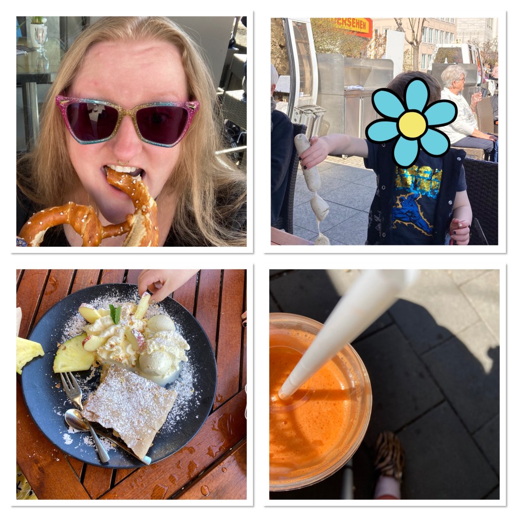 After a wander around the picturesque market, with our handmade delights purchased we found a lovely outdoor cafe to sample some German yums. The boy selected authentic Bavarian sausages and munched the lot. His Mummy & I played it safe with giant pretzels. Gran went for a truly a delicious apple strudel. We were mildly pleased with ourselves for navigating the German menu with the help of google. Even happier to receive what we had intended to order!