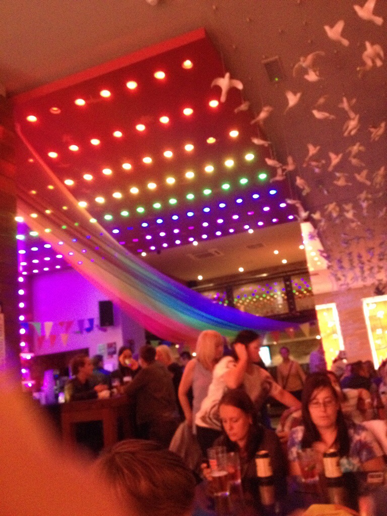 Glasgow pride was my next excursion. The event was displaced this year due to us hosting the commonwealth games. The new venue wasn’t really up to scratch, but Bil & I still had a fun day. There were lots of freebies (naughty, tasty & practical) plus the usual buoyant pride atmosphere. Unfortunately the Glasgow weather chased Bil & I inside to escape the down pour. We withdrew to Delmonica’s for a chat & to review our swag.