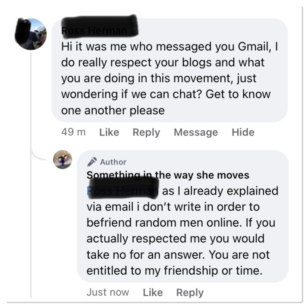 Women do not owe you anything. You are not entitled to a chance, a reply or a second of our time. Listen to me, do not send that message. Don’t call us babe. Don’t type a bunch of kiss emojis and absolutely do not send a dick pic. No one wants to see any of it. What’s actually going to happen is immediate BLOCK. I mean this sincerely, take your creepy messages & fuck off.