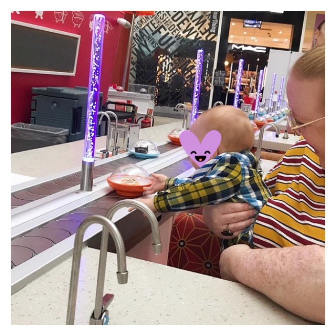 I kicked off the weekend with a bit of shopping & sushi with my wee sis. Of course the baba was also along for the ride. He got a little bored of the shopping portion of the day, sushi though, he loves. He can’t eat it yet, but chasing it along the conveyor is a very good game. I have a bit of a spending bug at the moment, so I treated myself to some little lovelies (stay tuned for details). We did a lot of cooing over baby clothes. Plus some admiring of all the Xmas decorations that have just hit the shops. Then closed the day with tea, cake & a snooze for the little man.