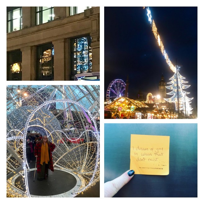 Last week I had some Xmassy cocktails with my favourite man. I took a trip to the very rainy seaside to do some giggling with my lovely Lisa & her equally lovely boy. I checked Edinburgh’s pretty lights on the way home. Of course I spread a little #projectpostit wisdom as I went.